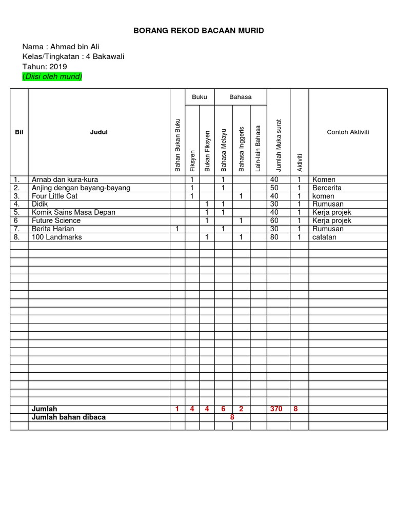 MURID BORANG REKOD BACAAN MURID NAMA MURID MOHD SARID B SAID KELAS TINGKATAN 4 ARIF TAHUN 2019 BilJudulBahan Bukan. Share to Twitter Share to Facebook Share to Pinterest. IQ NILAM SR IQ NILAM SM Contoh Rekod Bacaan NILAM 2020 IQ NILAM SR IQ NILAM SM Contoh Rekod Bacaan NILAM 2020.
