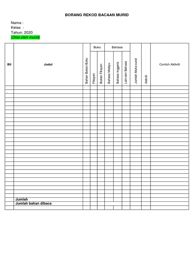 Borang Rekod Bacaan Murid Nilam 2019 Pdf